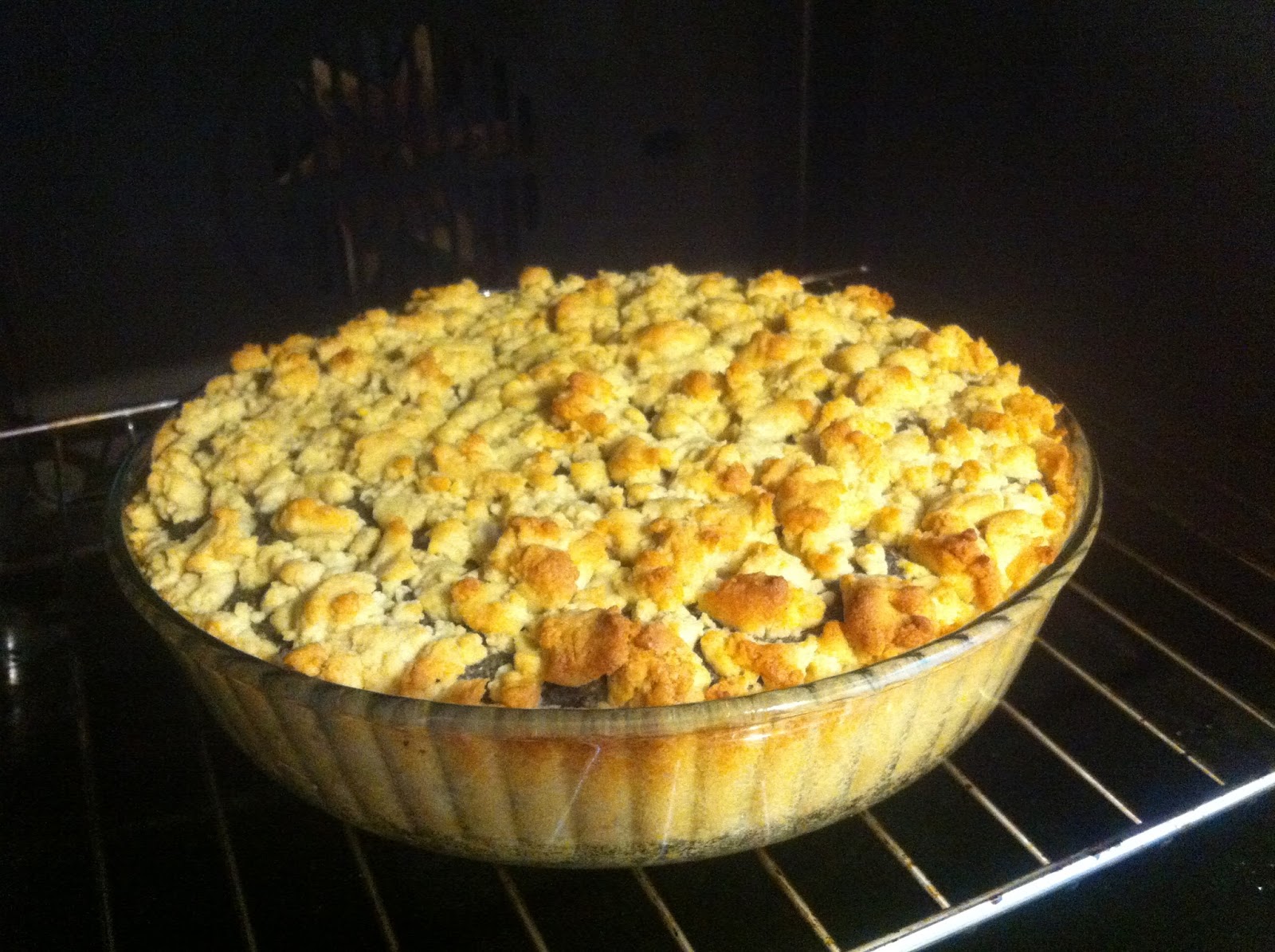 Włożyć 3/4 ciasta do formy, następnie masę budyniowo-makową i na wierzch wyskubać resztę ciasta.